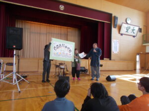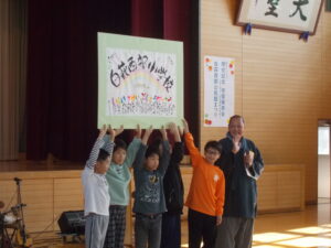 1つ目は、PTA企画の「みんなで作ろう!お名前詩」です。全校児童が親子で考えてきた「しらはぎせいぶしょうがっこう」を頭文字にしたお名前詩。これを、名前詩人の西田みのる先生が、一つの作品にしてくださいました。