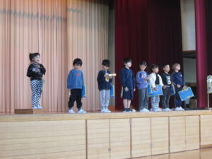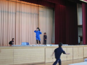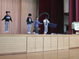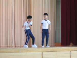 ゲームの世界に入った3年生が、マットステージ、音楽ステージ、自慢ステージをクリアしていくという工夫した内容です。生き生きと表現していました。