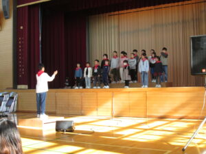 2つめは、「団別!校歌でのど自慢」です。赤団と青団に分かれて、校歌を歌い、ゲストの寺崎美幸さんと、水林史さんに講評をいただきました。