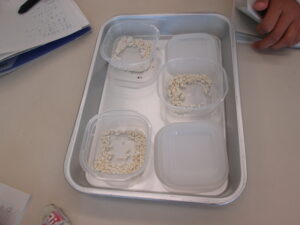 味噌は何からできているのかを考え、味噌のできる工程を学びます。「こうじ」を見せてもらって香りをかいだり、先生の作られた味噌を見せてもらったりと、実物にふれながら味噌に関する知識を広げていきました。