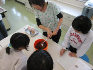 5年生は、家庭科の時間に、栄養教諭の石田先生とお味噌汁の学習をしました。