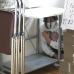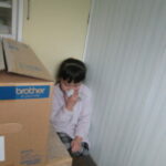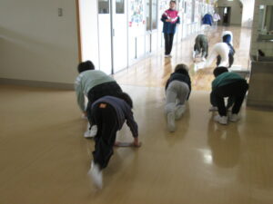 かくれんぼが始まりました。ぞうきんがけで移動しています。
