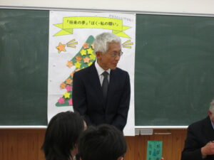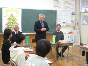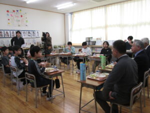 5・6年生の教室に、町長さん、教育長さん、事務局長さんをお招きして「ふれあい給食」が行われました。子供たちは、普段なかなかお会いしたり、お話したりすることのできない皆様との会食を、朝からとても楽しみにしていました。