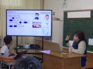 まず初めにお話をしてくださったのは、薬品会社に勤めている 堀口郁翔さんです。薬には「一般医薬品」と「医療用医薬品」があること、そして高い品質と安全性を保つために、厳しい品質検査や丁寧な包装が行われていることを教えていただきました。
