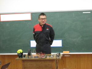 続いて、自動車整備士として働く 村上陽三さん のお話を聞きました。お客さんが安全・快適に車に乗れるよう、不良部分がないかを調べたり修理したりする仕事について分かりやすく教えてくださいました。
