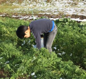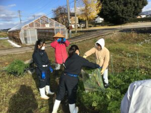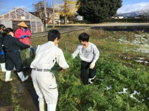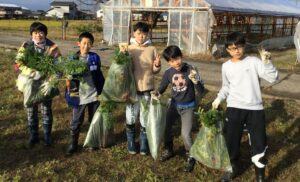 続いては、待ちに待った人参の収穫です! 8月に蒔いた種が、立派な人参に成長していました。「大きいの採れた!」と歓声があがり、子供たちは大喜び。こちらも高校生の皆さんが大切に育ててくれていたおかげです。