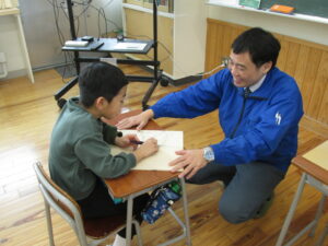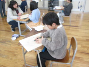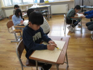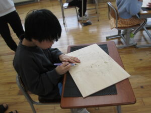 子供たちは、初めて彫刻刀を使うので、安全に使うための指導をしてもらい、板の裏に簡単な図形を描いて、まずは練習をしました。