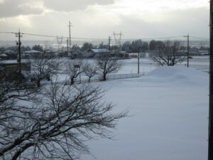 外は雪。学校から見る雪景色も思い出の1ページとして・・・