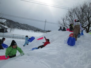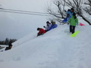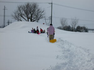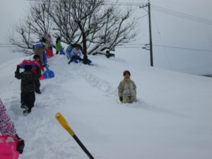 【1・2年】雪あそび 2026年1月22日 1年, 2年 体育の時間に、学校のスキー山で雪あそびをしました。 たっぷり降った新雪の上を、みんなで1列になって、道を作りながら歩きました。 最初は、なかなか滑りません。みんなで少しづつ滑るルートを作っていきます。 だんだん、滑りやすくなってきました。 「たのし~い!」 歓声が上がります。 みんなで仲良く安全に、雪あそびを楽しむことができました。